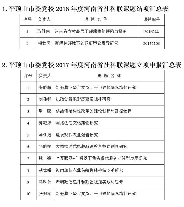 截止2017年3月15日,我校圆满完成2016年度省社科联课题结项和2017年度省社科联课题立项申报工作,其中2016年度省社科联课题结项2项,2017年度省社科联课题立项申报10项。具体情况如下: